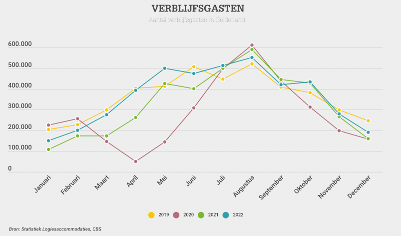 - Er zijn 13,7% meer overnachtingen in Gelderland ten opzichte van 2021.