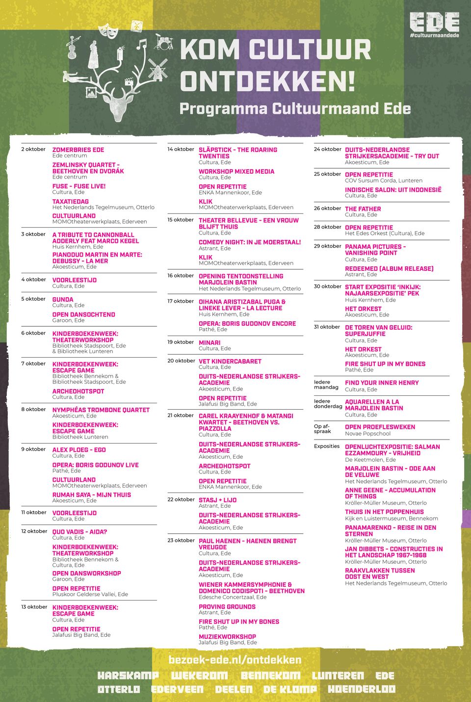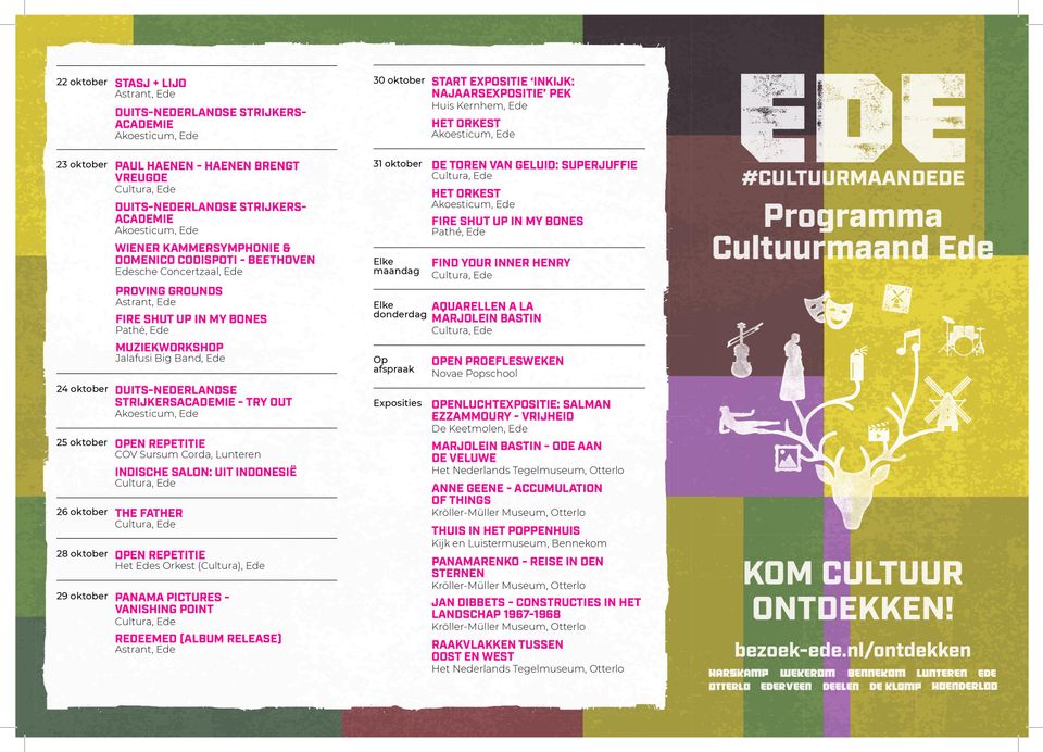 De hele maand oktober staat 'Cultuurmaand Ede' op de agenda. In samenwerking met de cultuurmakelaar van de Gemeente Ede is de najaarscampagne #KomCultuurOntdekken opgezet. Met deze campagne wordt de spotlight gericht op het grote aanbod aan culturele activiteiten die in de maand oktober plaatsvinden, bij zowel de amateurverenigingen als bij de professionele organisaties. De campagne is zichtbaar via offline uitingen en online media op diverse locaties in de hele gemeente Ede en richt zich op de bewoners van de gemeente en regionale bezoekers.